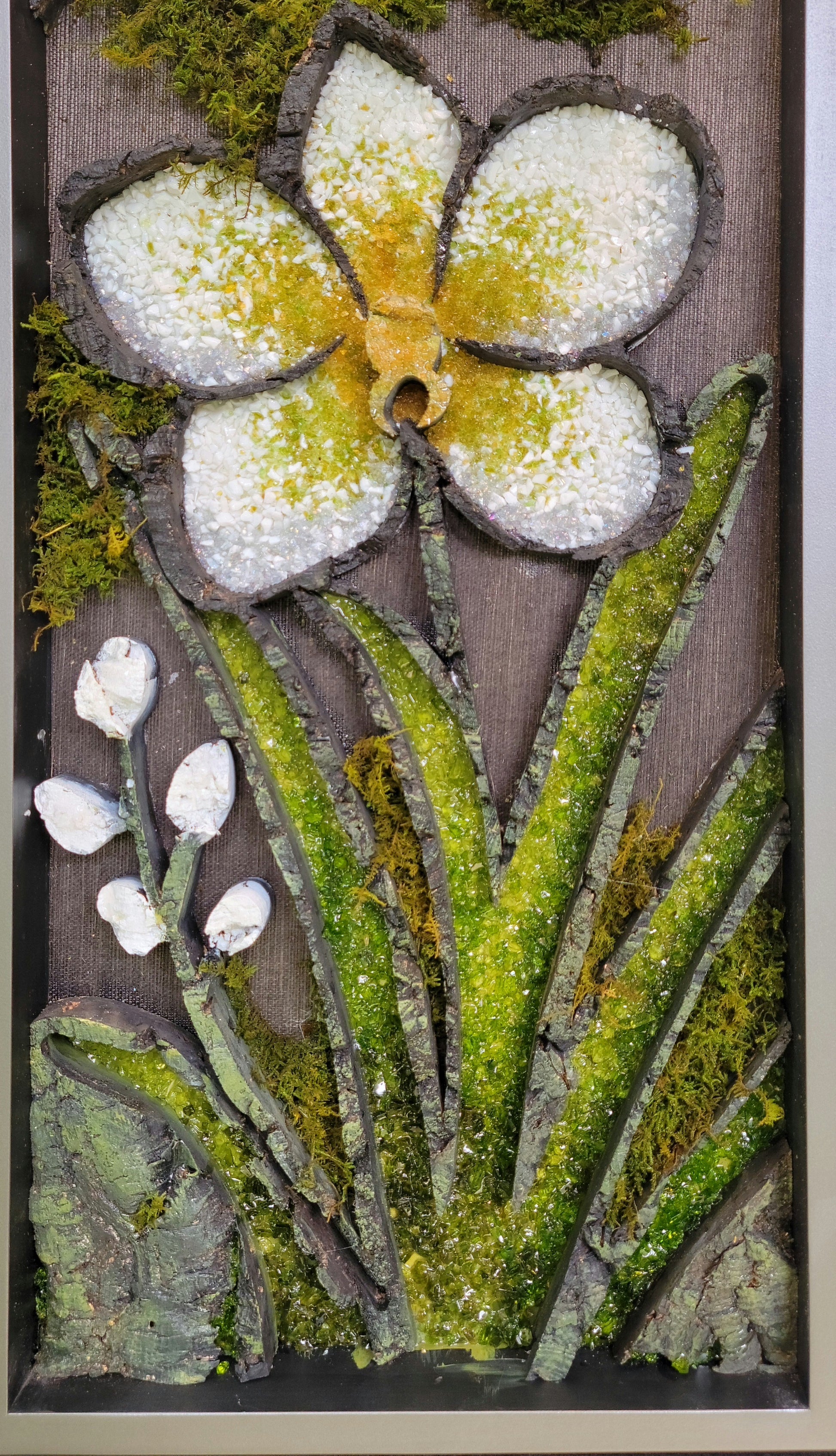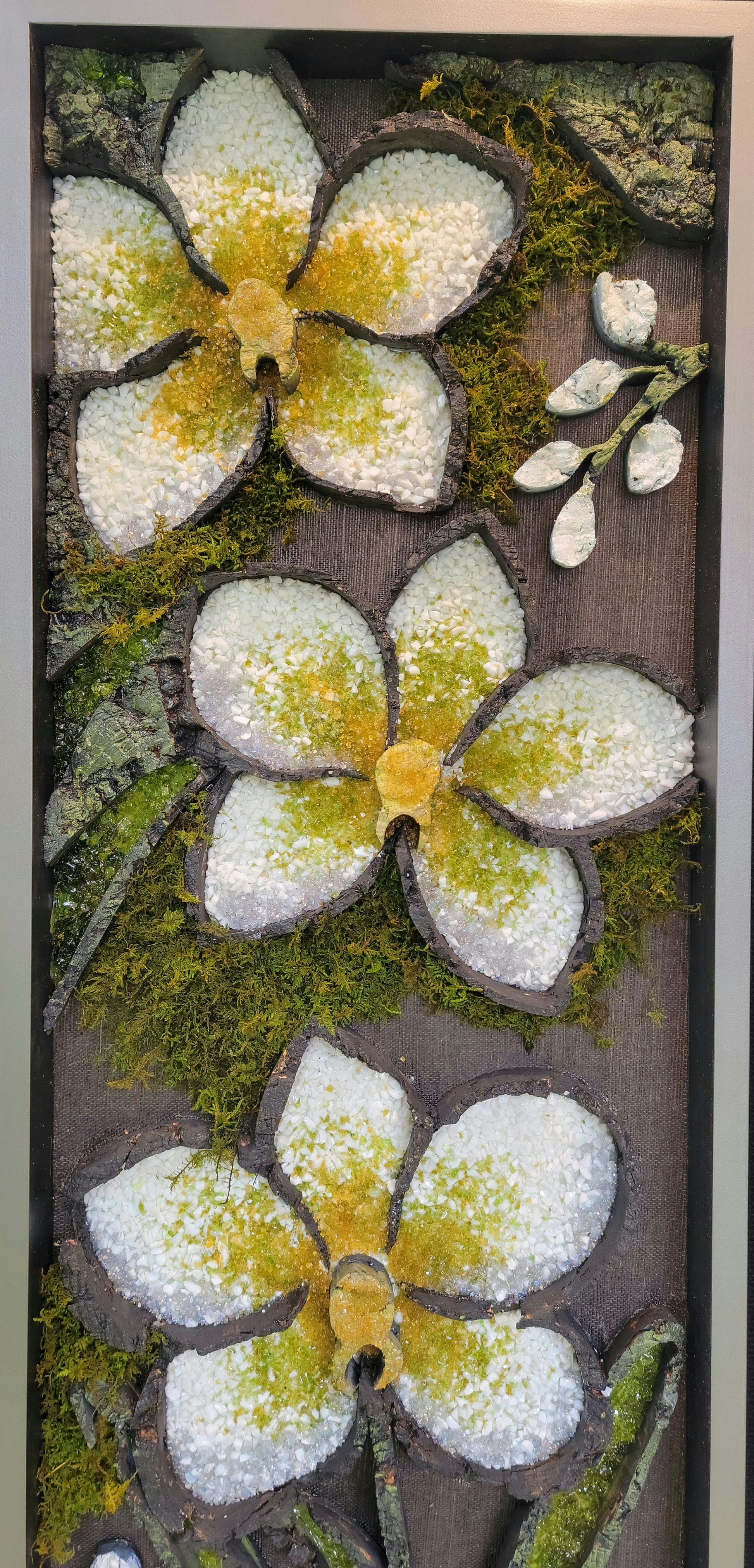 Carved cork, grasscloth, glass mosaic, preserved moss. 2 - 15”x36”. Call Stephanie at 954.670.9370 for pricing and availability.